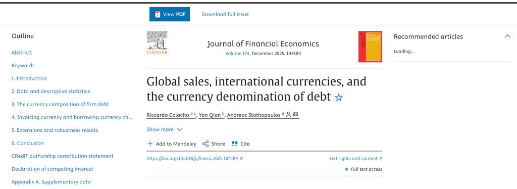 近期,我院助理教授钱言,与美国北卡罗来纳大学教堂山分校教授Riccardo Colacito和Andreas Stathopoulos合作撰写的论文“Global Sales, International Currencies, and the Currency Denomination of Debt”被金融学顶刊Journal of Financial Economics正式发表。